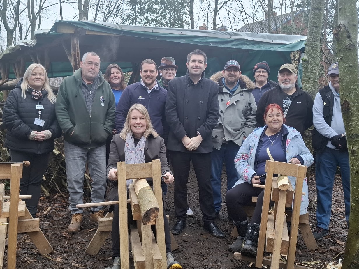 The activity takes place at woodlands near Squatters Cottage and during his visit, Shaun Davies MP saw firsthand the positive impact the programme has for veterans, who attend the weekly sessions. The programme offers a supportive environment where veterans can connect with others who understand their experiences and learn new skills, including green woodworking – a form of woodworking that uses ‘green’ or unseasoned timber.