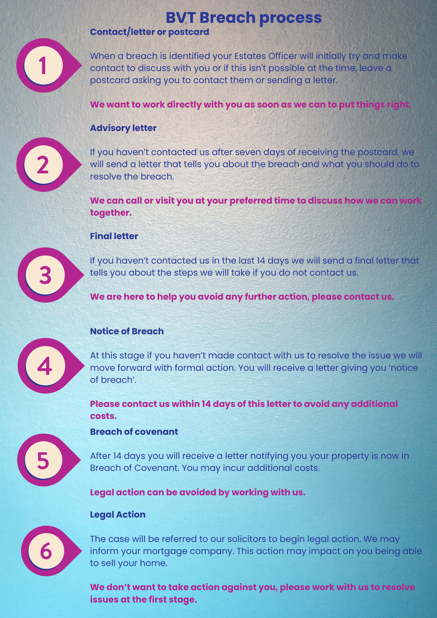 When you buy or rent a home in Lightmoor Village, you sign a document called a TP1 or tenancy agreement. This details what you can and can’t do to the outside of your home and within its boundaries. These rules are called covenants and they are legally binding and enforceable.